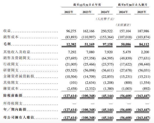 2025年前三季度净亏损进一步扩大,公司前9个月亏损为1.63亿元,上年同期的期内亏损为5661万元,同比下降65%。营收为1.88亿元,较上年同期的1.57亿元增长19.7%;毛利为8411万元,上年同期的毛利为5009万元。
