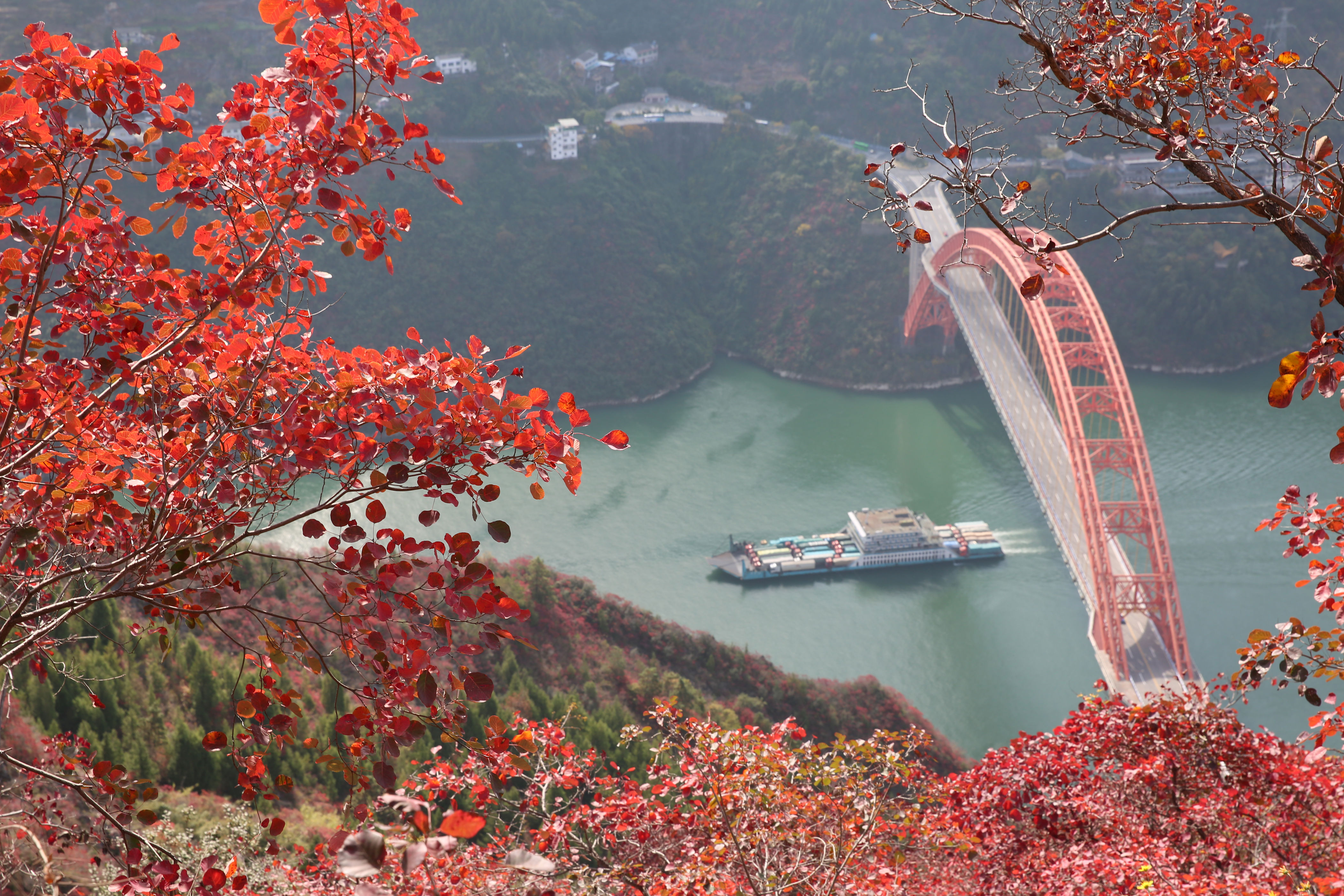 ▲巫山县巫峡两岸云上速融,漫山红叶红似火,过往船只如在画中穿梭。(资料图片)通讯员 冯光伦 摄
